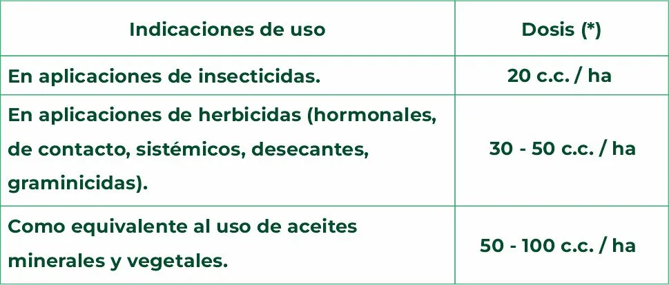 Puede ser utilizado en lugar del aceite en aplicaciones de insecticidas, fungicidas y herbicidas. Con tal propósito, además tiene efecto antievaporante lo que se traduce en una mayor eficiencia del tratamiento.